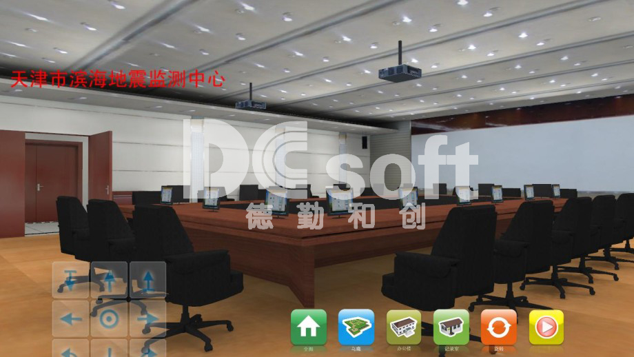 当操作者点击任意台站,均将进入该台站三维漫游视景,在此级场景中,可身临其境于一个台网中心,或一个前兆台站,或漫游于台站中的地下室,查看地下设备的样式和布局,点击设备将出现实时连接的设备运行参数。